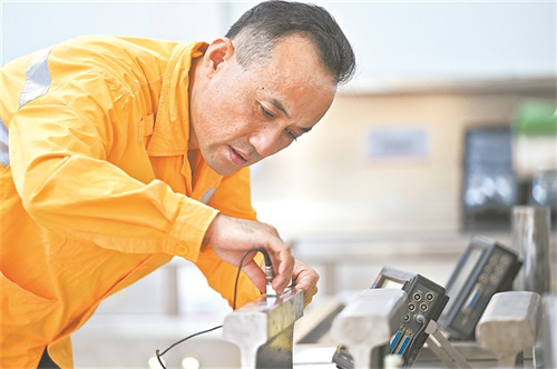 圖為徐鵬在標定焊縫探頭的基準靈敏度。王 瑋 攝