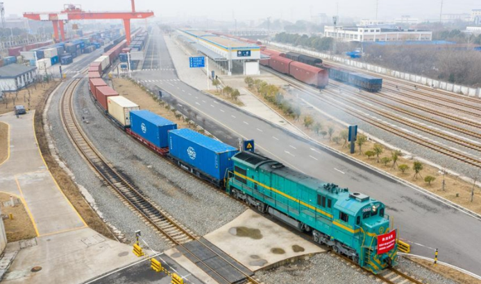 Aerial photo shows a China-Europe cargo train loaded with containers of electronic products and accessories of household appliances leaving for Russia's Vorsino in Nanjing, east China's Jiangsu Province, Jan. 27, 2021. A total of 60,000 twenty-foot equivalent unit (TEU) containers have been shipped from Nanjing to Europe since its maiden journey in 2016. (Xinhua/Li Bo)