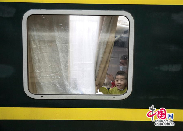 小男孩兒拉開(kāi)窗簾,熱切期待列車(chē)開(kāi)動(dòng)的時(shí)刻。中國網(wǎng)記者 馬曠/攝