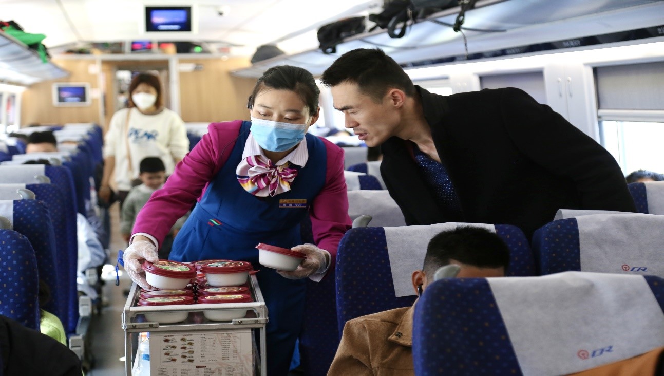 列車(chē)服務(wù)人員向旅客銷(xiāo)售小碗菜